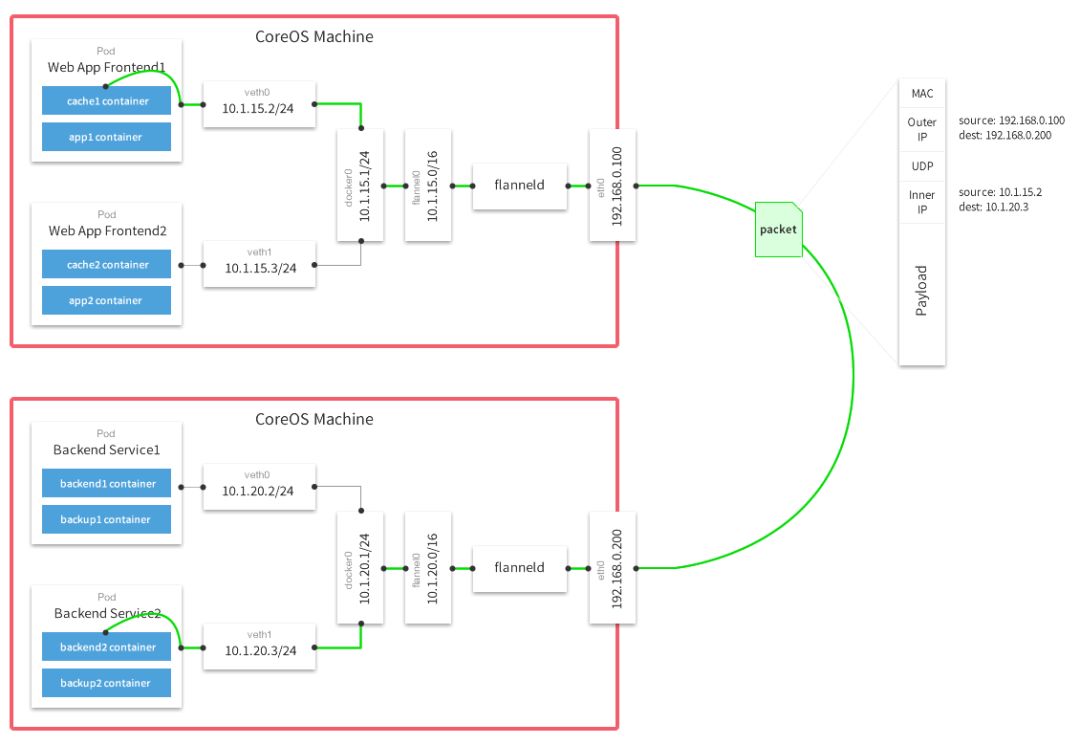 并为容器配置名为docker0的网桥,实际是通过修改Docker的启动参数–bip来实现的。通过这种方式,为每个节点的Docker0网桥设置在整个集群范围内唯一的网段,从保证创建出来的Pod的IP地址是唯一。