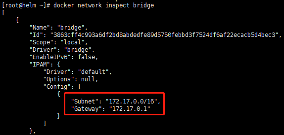 通过 docker network inspect bridge 可以查看网桥的子网网络范围和网关: