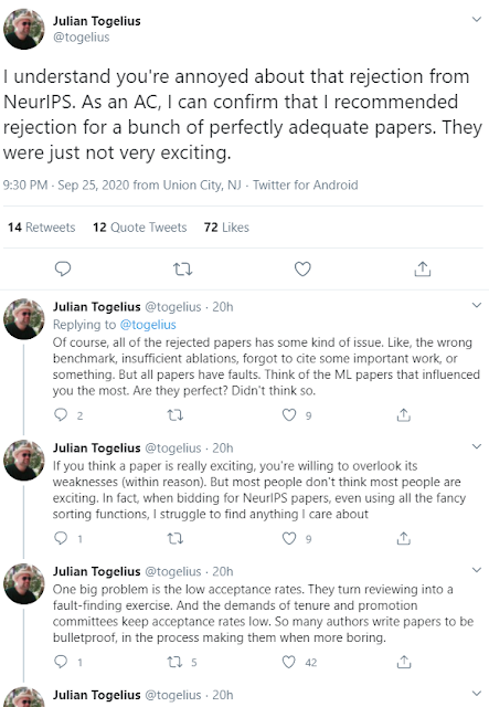 :NeurIPS 2020 的领域主席之一 Julian Togelius 提到,他拒绝许多论文的原因就只是它们不够激动人心。只有 Julian 自己知道什么样的论文能打动他的心,不过我认为他的意思是在选择研究课题和解决方案上「有良好的品味」。