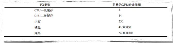上图展示了不同的 IO 操作所占用的 CPU 时钟周期,在计算机中,CPU 的运算速度最快,以其的运算速度为基准,时钟周期为1。其次是一级缓存、二级缓存和内存,硬盘和网络最慢,它们所花费的时钟周期和内存所花费的时钟周期差距在五位数以上,更不用提跟 CPU 和一级缓存、二级缓存的差距了。