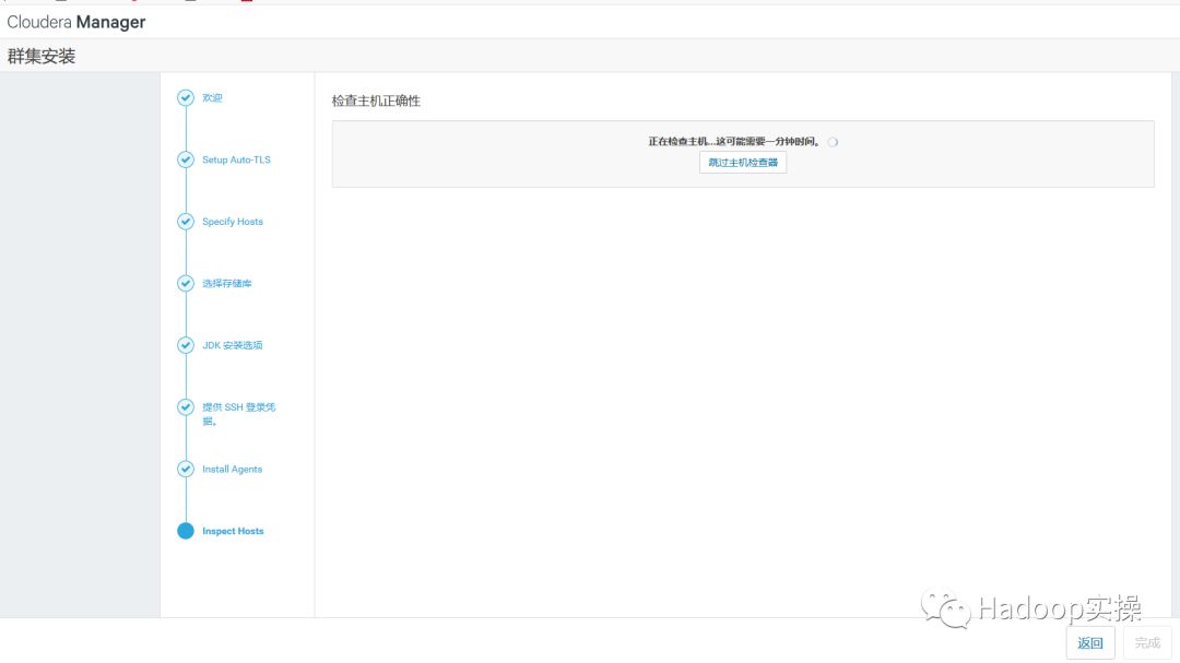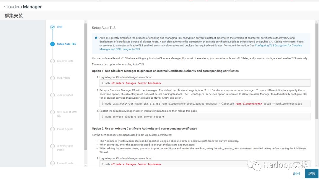 10.在安装过程中会有页面提示Auto-TLS,该步骤可以忽略,不过如果对主机通信或者CM页面访问有SSL/TLS需求的话,也可以按照提示进行配置。