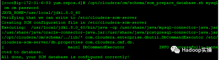 5.在配置Cloudera Manager连接到数据库时的脚本有所变化。以前是/usr/share/cmf/schema/scm_prepare_database.sh,现在是/opt/cloudera/cm/schema/scm_prepare_database.sh