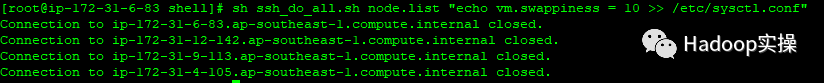 [root@ ip-172-31-6-83 shell]# sh ssh_do_all.sh node.list "echo vm.swappiness = 10 >> /etc/sysctl.conf"