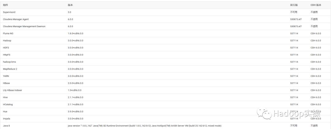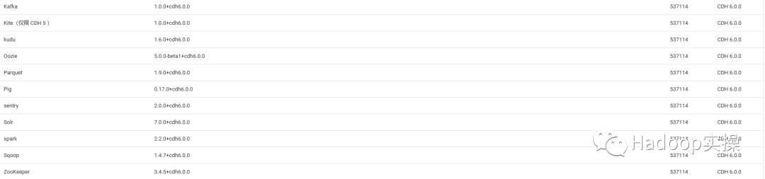 可以看到Hadoop3.0,Flume1.8,HBase2.0,Hive2.1,Spark2.2,Hue3.9,Impala3.0,Kafka1.0.0,Kudu1.6,Oozie5.0,Pig0.17,Senty2.0,Solr7.0,Sqoop1.4.7,Zookeeper3.4.5等。