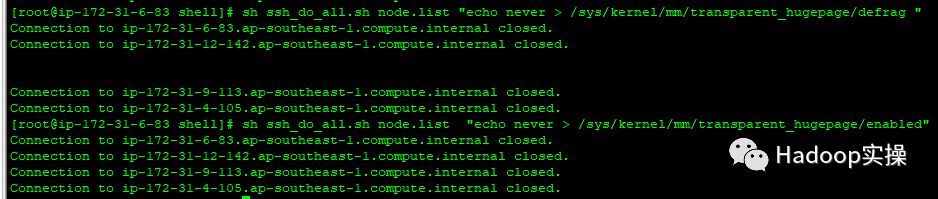 [root@ ip-172-31-6-83 shell]# sh ssh_do_all.sh node.list "echo never > /sys/kernel/mm/transparent_hugepage/enabled"