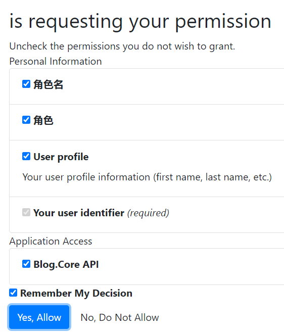 重点是要配置那几个Scope作用域,然后可以看到有ids4的授权页面,当然,这个页面也可以屏蔽掉不显示。