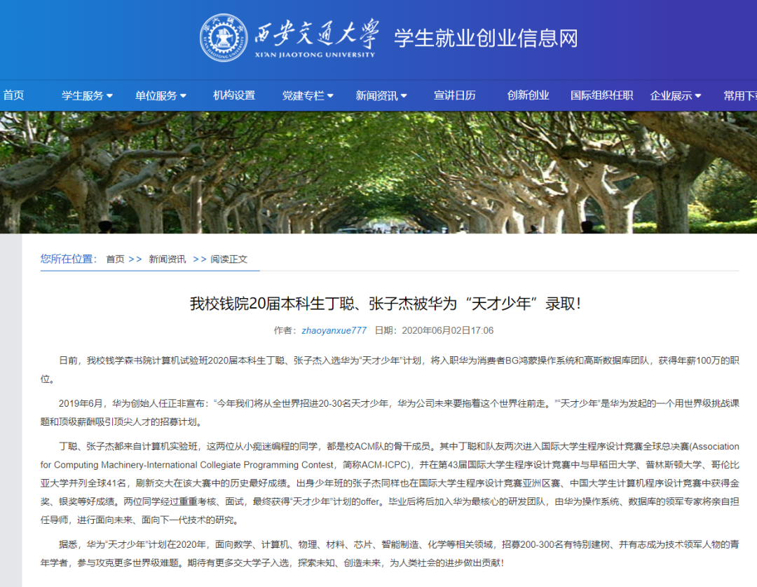6月初,西安交通大学官方发布,其钱学森书院计算机试验班2020届本科生丁聪、张子杰入选华为“天才少年”计划,将入职华为消费者BG鸿蒙操作系统和高斯数据库团队,获得年薪100万的职位。