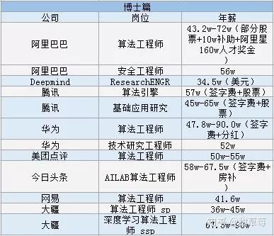 可以看到,2019年博⼠校招⾥,科研创新⽐较注重的公司(华为⼤疆)都给的⽐较⾼,Deepmind就不谈了,这个不在国内。但是,也要注意并不是所有博⼠都给这么⾼package,具体需要看研究领域是不是匹配,也要看公司是不是需要,所以就题⽬中的这个图来说,显然CV,ML,通信部分的先进研究是华为关注的重点。