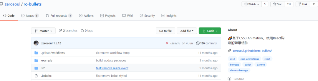 rc-bullets已经在Github上标星 331,累计分支 33。(详情:https://github.com/zerosoul/rc-bullets)