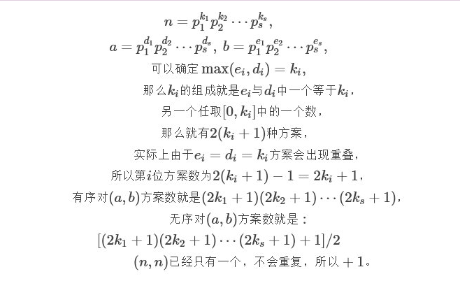 用第一条计算出a所有正因子的个数,除以2即得a正因子的对数,然后暴力枚举筛掉(1,b)以内的正因子对数
