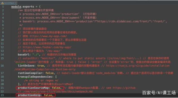 1、修改vue.config.js中的配置项,把productionSourceMap设置为false,不然最终打包过后会生成一些map文件,如果不关掉,生成环境是可以通过map去查看源码的,并且可以开启gzip压缩,使打包过后体积变小。