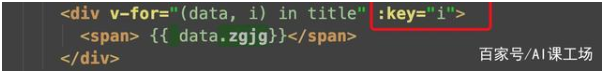 2、for循环设置key值,在用v-for进行数据遍历渲染的时候,为每一项都设置唯一的key值,为了让Vue内部核心代码能更快地找到该条数据,当旧值和新值去对比的时候,可以更快的定位到diff。