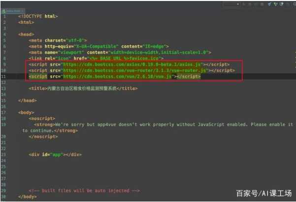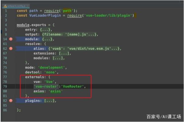 2、使用cdn的方式外部加载一些资源,比如vue-router、axios等Vue的周边插件,在webpack.config.js里面,externals里面设置一些不必要打包的外部引用模块。然后在入门文件index.html里面通过cdn的方式去引入需要的插件。