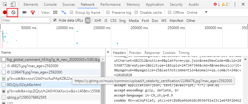 4.这里有个小技巧,先点击下图所示clear按钮,把network界面清空,再点击“点击加载更多”,就能直接找到第二页的数据。
