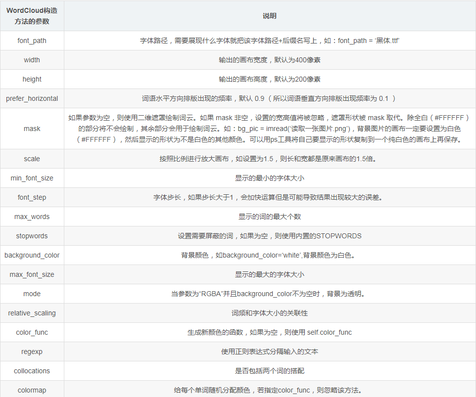 2.WordCloud更多参数详见下图,可以研究出更多的玩法;