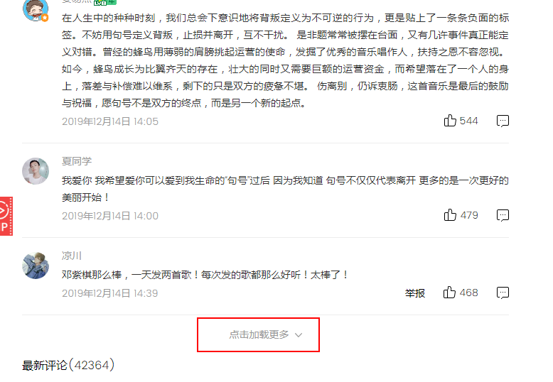 def get_comment(i):url_3 = 'https://c.y.qq.com/base/fcgi-bin/fcg_global_comment_h5.fcg'headers = {'user-agent':'Mozilla/5.0 (Windows NT 6.1; WOW64) AppleWebKit/537.36 (KHTML, like Gecko) Chrome/63.0.3239.132 Safari/537.36'}f2 = open(i+'评论.txt','a',encoding='utf-8')for n in range(20):params = {'g_tk_new_20200303': '5381', 'g_tk': '5381', 'loginUin': '0', 'hostUin': '0', 'format': 'json', 'inCharset': 'utf8', 'outCharset': 'GB2312', 'notice': '0', 'platform': 'yqq.json', 'needNewCode': '0', 'cid': '205360772', 'reqtype': '2', 'biztype': '1', 'topid': '247347346', 'cmd': '6', 'needmusiccrit': '0', 'pagenum':n, 'pagesize': '15', 'lasthotcommentid': 'song_247347346_3297354203_1576305589', 'domain': 'qq.com', 'ct': '24', 'cv': '10101010'}res_music = requests.get(url_3,headers=headers,params=params)js_2 = res_music.json()comments = js_2['comment']['commentlist']for i in comments:comment = i['rootcommentcontent'] + '\n——————————————————————————————————\n'f2.writelines(comment)f2.close()input('下载成功,按回车键退出!')