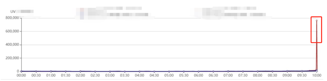 上图是对网站流量的监控。我们可以看到10:00时UV(访问用户)和client IP数量突然激增,翻了几千倍。