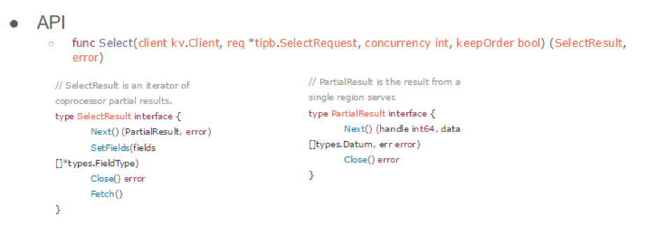 接着这个接口返回了一个数据结构,叫 SelectResult ,这个结构可以认为它是一个迭代器,因为我们下层是有很多 TiKV ,然后每个结果是一个 PartialResult。上层封装了一个 SelectResult ,就是一个 PartialResult 的迭代器。通过这个的 next 方法可以拿到下一个 PartialResult ,但是具体的下一个 PartialResult 是哪个的 region server ,是不一定的,就像我刚才说的,取决于你要不要 KeepOrder 。 SelectResult 的内部实现你可以认为是个 pipeline。我们会并发的去往各个 region server 发数据,但是可能有的先返回给你了,有的后返回给你了。虽然某个 region 存储数据的 key 的范围比另外一个 region 的小,但是要不要先把某个 region 的结果返回给你,是由你这个 KeepOrder 决定的。