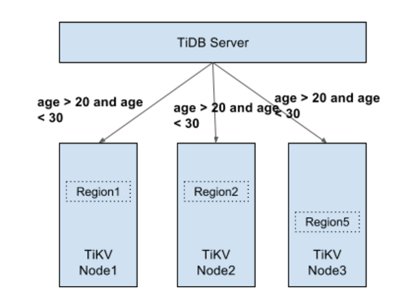 这个接口还是挺重要的。举个例子吧,来看一下我们怎么去做这个分布式的 SQL ,比如 select * from t where age > 20 and age < 30。在这里, t 这个数据可能分布在很多 region 上,我们会把要扫描 t 这个表的信息以及这个 filter,整个推到 region server 上进行计算,然后 Executor 构造的就是比如说我要扫哪个表,它的表的信息是什么。通过这个表的信息,下层就能去构造 KV,Ti-Client 就能通过这些 KV 找到这个表的数据分布在哪些 region 上面,然后它就会把这个请求发在这些 region 上面,同时在 selecter request 信息里面也会带上我要做 filter 的那个 condition,它会把要查询的表的元信息等都发到存储个表数据的 region server 上。然后它再利用表的信息把数据拿出来并过一遍 filter,只有过了这个 filter 的数据,之后才会返回给 TiDB。这样一方面能够增加这个计算并行度,因为我们可能有很多 region server 存储这个数据,当然只有有这个数据的 region server 我们才会发请求过去。