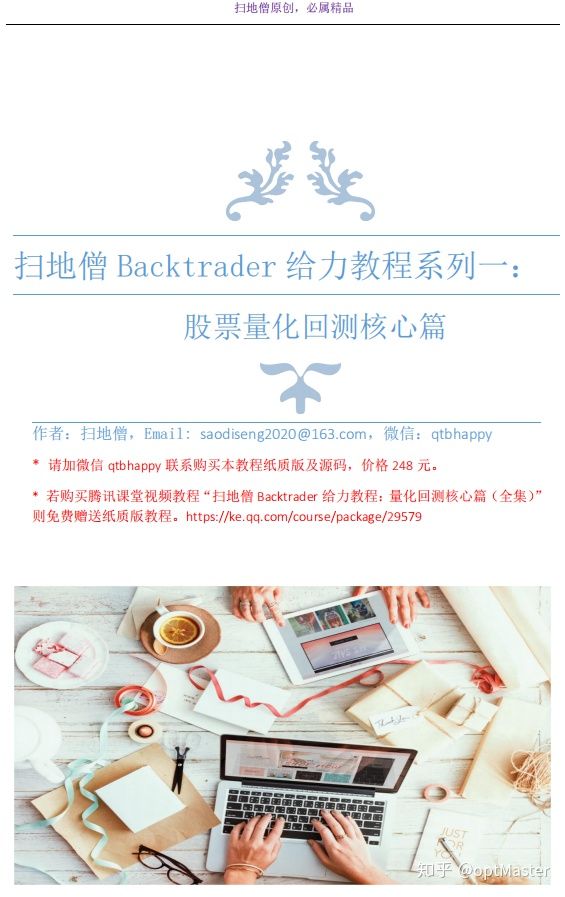 因此,为推动backtrader在中国的普及,我们编写了目前国内唯一(也是世界唯一) 的backtrader纸质版技术教程《扫地僧Backtrader给力教程系列一:股票量化回测核心篇》,并在腾讯课堂开发了对应的视频课程“扫地僧 Backtrader 给力教程:股票量化回测核心篇”,本课程并不完全按照backtrader文档讲解,而是针对中国用户的思维讲解,极大地降低中国用户的学习门槛。