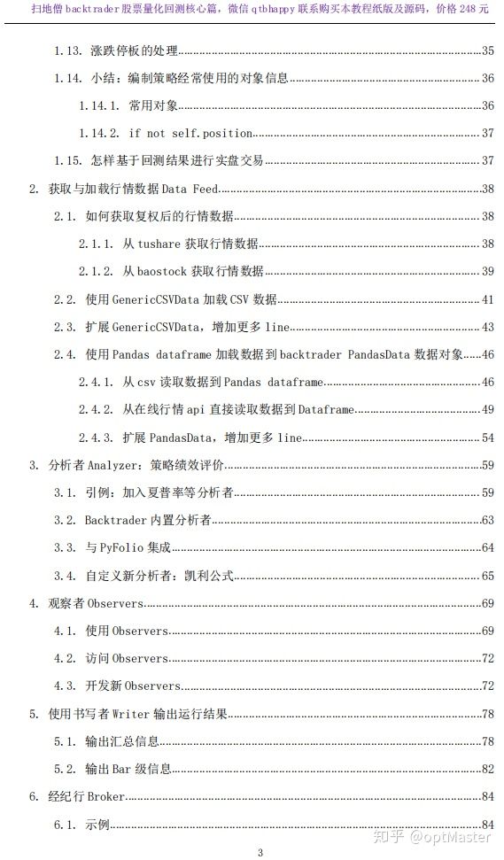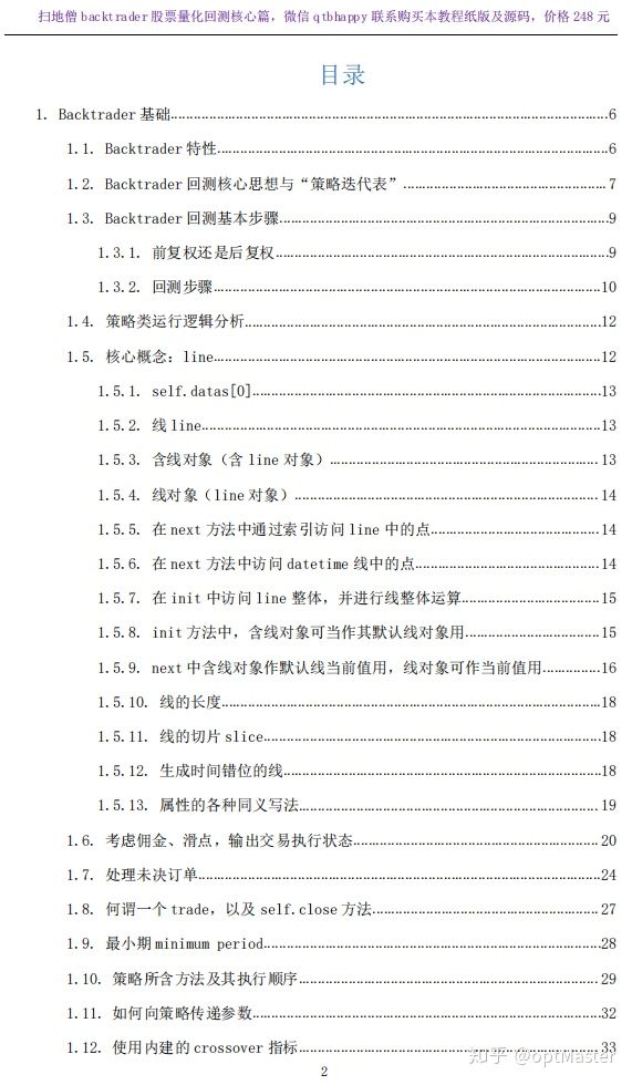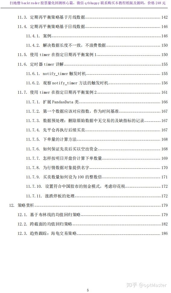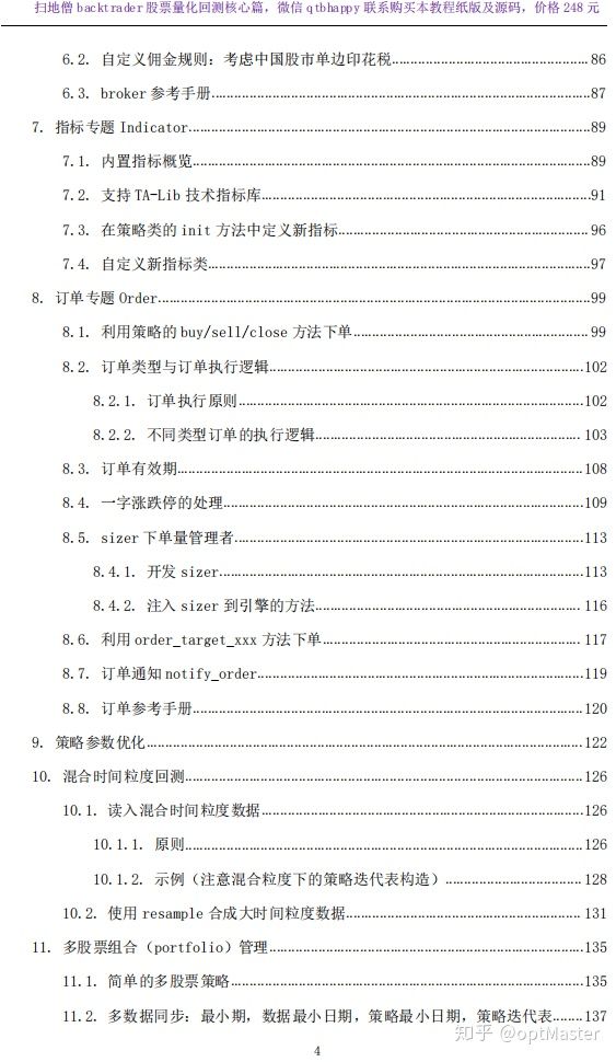 我们开发的纸质版教程目录如下,这其中最重要的概念和章节是1.2节,11.2节介绍的策略迭代表概念;11.7节介绍的多股票组合操作重要技术,理解了这几部分内容,就可以比较自如地回测策略了。