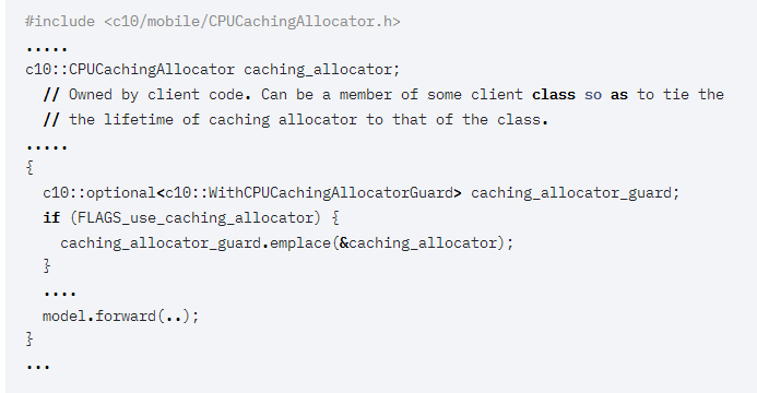 缓存分配器本身归客户端所有,客户端拥有的缓存分配器然后可以与c10::WithCPUCachingAllocatorGuard 一起使用,以允许在该作用域内使用缓存分配。