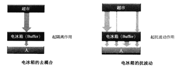 如果没有电冰箱,每次我们想吃东西时,都要去超市,用专业术语来讲,这就是耦合性太强了,如果超市关门了怎么办?如果超市太远了怎么办?有了电冰箱后,从超市买的食物就放在电冰箱中,我们就直接从电冰箱中取食物,而不需要关注超市的状况了。电冰箱去除了人和超市的耦合。