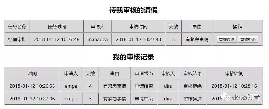 由于已完成的请假在数据库runtime表中查不到(runtime表只保存正在进行的流程示例信息),所以需要在history表中查询。