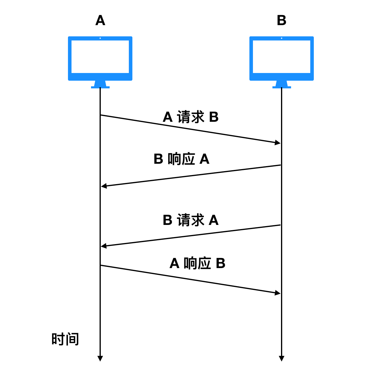 如图所示,A 和 B 是两个不同的端系统,它们之间可以作为信息交换的载体存在,刚开始的时候是 A 作为请求方请求与 B 交换信息,B 作为响应的一方提供信息;随着时间的推移,B 也可以作为请求方请求 A 交换信息,那么 A 也可以作为响应方响应 B 请求的信息。