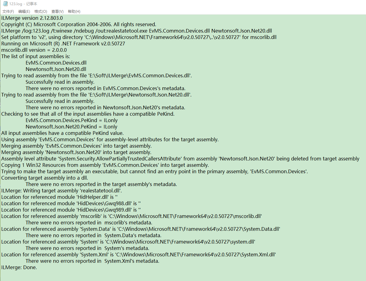 ILMerge.exe /log:123.log /t:winexe /ndebug /out:realestatetool.exe EvMS.Common.Devices.dll Newtonsoft.Json.Net20.dll