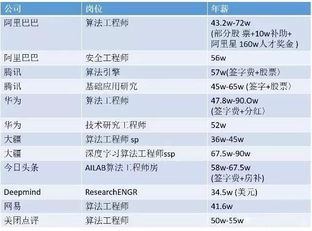 从以上清单来看,华为、大疆在算法工程师岗位上开出了高达90w年薪的岗位薪资。当然,薪酬最高的当属deepmind,高达34.5w美元。今日头条也大大发力,薪酬方面比美团、大疆、腾讯的部分岗位都高。