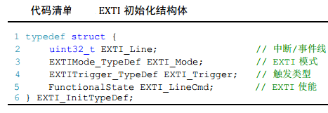 标准库函数对每个外设都建立了一个初始化结构体,EXTI对应为EXTI_InitTypeDef,结构体成员用于设置外设工作参数(配置外设相应的寄存器),并由外设初始化配置函数调用。