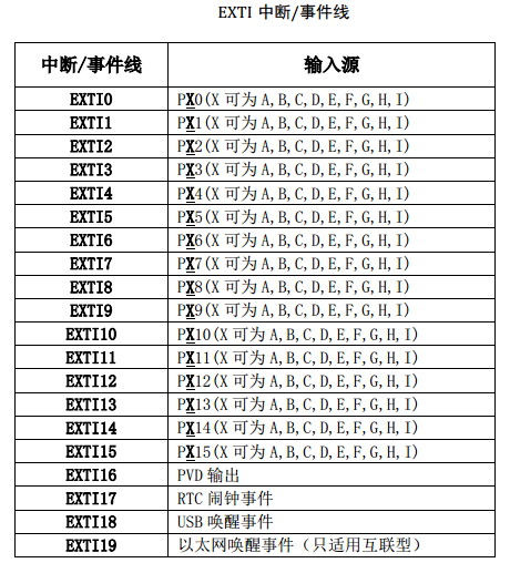 注:EXTI实际上主要就是为GPIO(PX0~PX15(X=A B C D E F G H I))服务的,除此之外还有PVD输出、RTC闹钟事件、USB唤醒事件、以太网唤醒事件(只适合互联型)