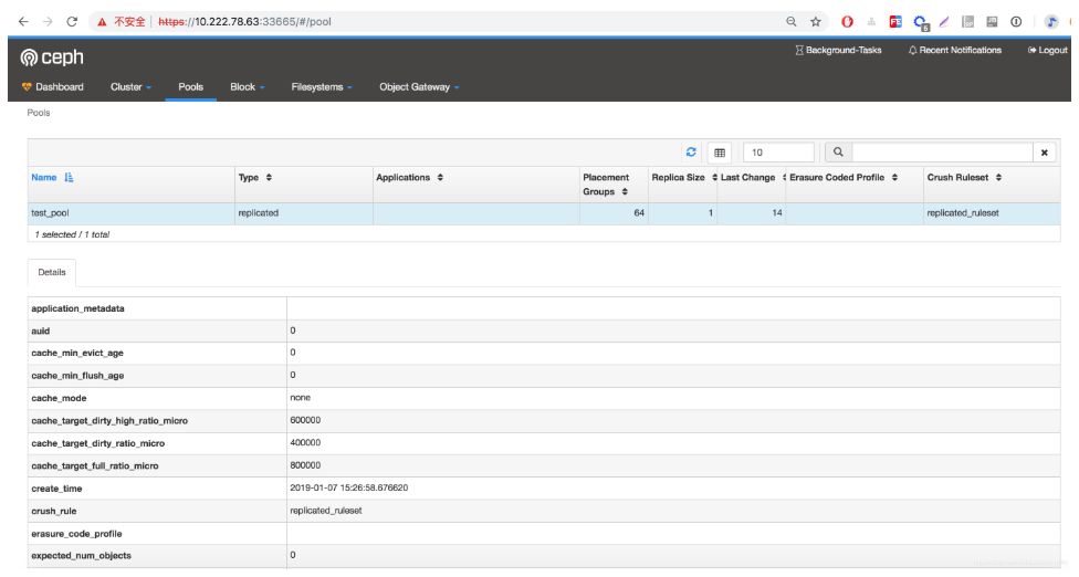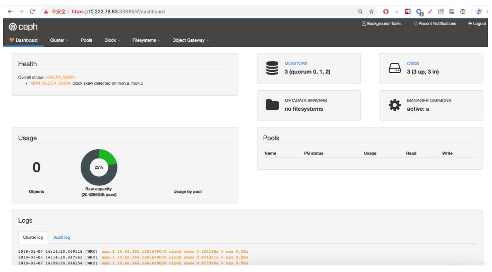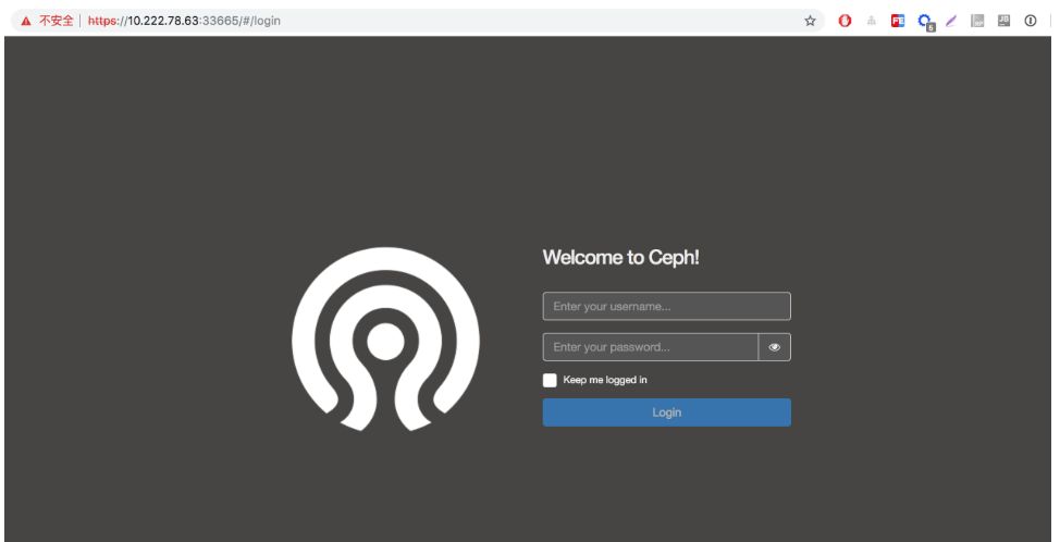 $ kubectl create -f dashboard-external-https.yamlservice/rook-ceph-mgr-dashboard-external-https created$ kubectl get svc -n rook-ceph |grep mgr-dashboardrook-ceph-mgr-dashboard ClusterIP 10.68.18.172 <none> 8443/TCP 23mrook-ceph-mgr-dashboard-external-https NodePort 10.68.95.24 <none> 8443:33665/TCP 6m58s