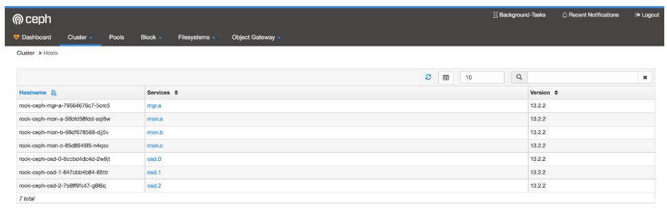 $ kubectl get pod -n rook-cephNAME READY STATUS RESTARTS AGErook-ceph-mgr-a-79564676c7-5crc5 1/1 Running 0 30mrook-ceph-mon-a-56bfd58fdd-sql6w 1/1 Running 0 31mrook-ceph-mon-b-68df678588-djj5v 1/1 Running 0 31mrook-ceph-mon-c-65d8945f5-n4qsv 1/1 Running 0 30mrook-ceph-osd-0-6ccbd4dc4d-2w9jt 1/1 Running 0 30mrook-ceph-osd-1-647cbb4b84-65ttr 1/1 Running 0 30mrook-ceph-osd-2-7b8ff9fc47-g8l6q 1/1 Running 0 30mrook-ceph-osd-prepare-10.222.78.63-vvv9r 0/2 Completed 1 30mrook-ceph-osd-prepare-10.222.78.64-nbfwz 0/2 Completed 0 30mrook-ceph-osd-prepare-10.222.78.86-gp6fj 0/2 Completed 0 30m