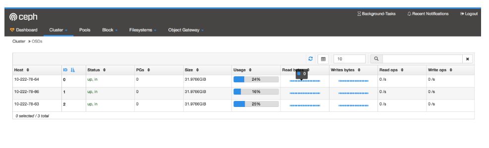 不过目前只能查看 cluster 中的 Hosts、Monitors、OSDS 信息,其他 Pools (数据池)、Block (块设备)、Filesystem (文件系统)、Object Gateway (对象存储)暂时没有涉及到,下边会逐步演示到。