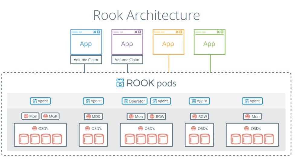 使用 Rook 部署并管理 Ceph 存储系统,其架构图如下: