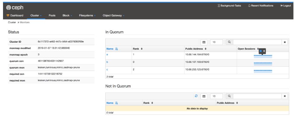 $ kubectl -n rook-ceph get pod | grep rook-ceph-monrook-ceph-mon-a-56bfd58fdd-sql6w 1/1 Running 0 43mrook-ceph-mon-b-68df678588-djj5v 1/1 Running 0 43mrook-ceph-mon-c-65d8945f5-n4qsv 1/1 Running 0 42m