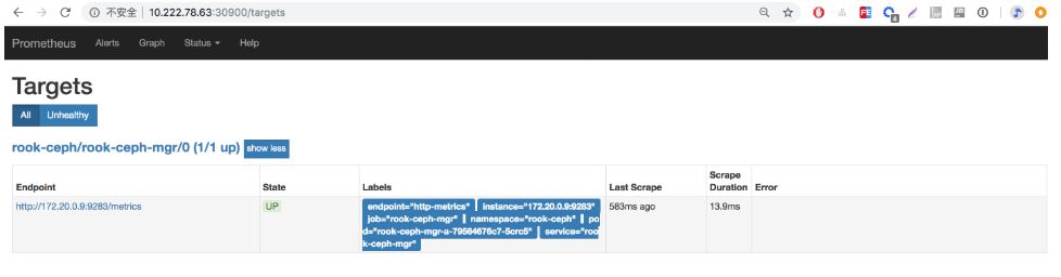 $ kubectl -n rook-ceph get svc |grep rook-prometheusrook-prometheus NodePort 10.68.152.50 <none> 9090:30900/TCP 13m