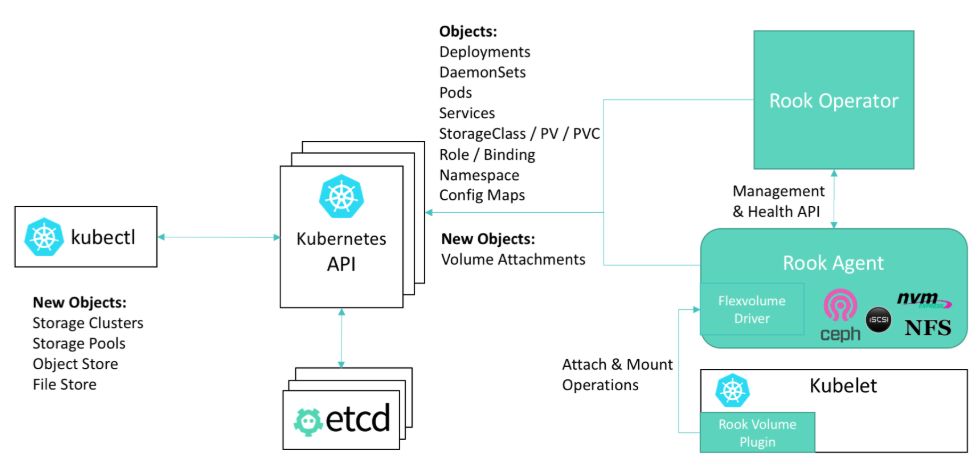 Rook Agent 代理部署在 K8S 每个节点上以 Pod 容器运行,每个代理 Pod 都配置一个 Flexvolume 驱动,该驱动 主要用来跟 K8S 的卷控制框架集成起来,每个节点上的跟操作相关的操作,例如添加存储设备、挂载、格式化、删除存储等操作,都有该代理来完成。