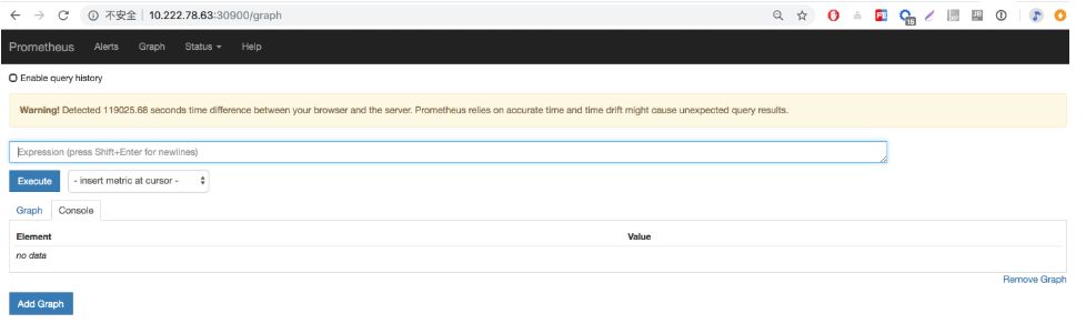 Prometheus Dashboard 服务启动后,默认暴漏服务类型为 NodePort,端口号为 30900,那么我们可以通过访问 http://<Cluster_IP>:30900 页面,这里我可以通过 http://10.222.78.63:30900 地址访问。