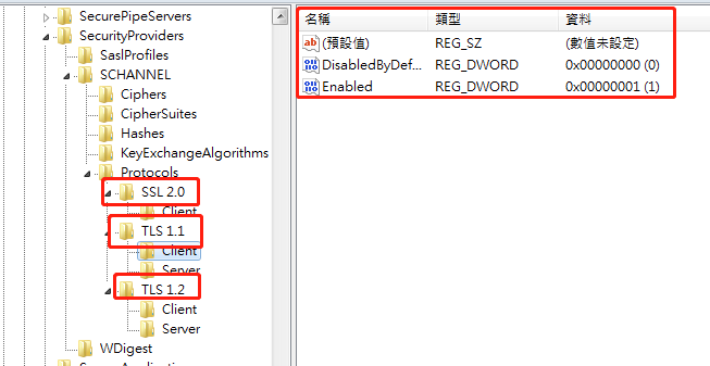 找到TL2 1.1 和TLS 1.2 将里面Server和Client两项的值均改为