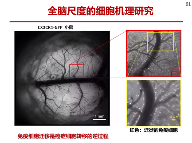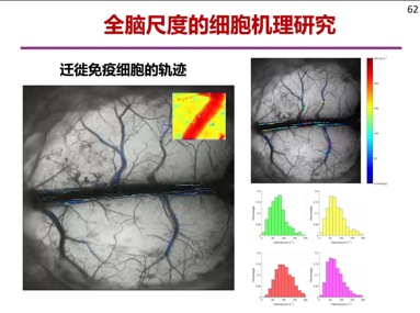 生命科学成像仪器RUSH-I是多维多尺度高分辨计算摄像仪器,可以全脑尺度下观察到细胞运动,比如实时监测实验所用的免疫细胞运动。并首次对音乐刺激下的清醒小鼠全脑皮层神经网络活动进行高速成像,展示出小鼠全脑皮层、亚细胞级、结构与功能统一 。