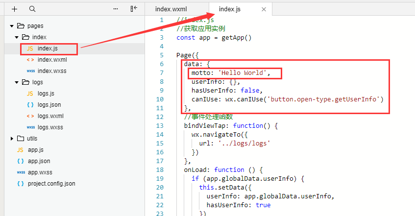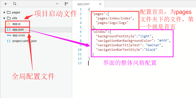 项目根路径下的app.js文件为项目启动交互逻辑文件,app.json文件为项目的全局配置文件。