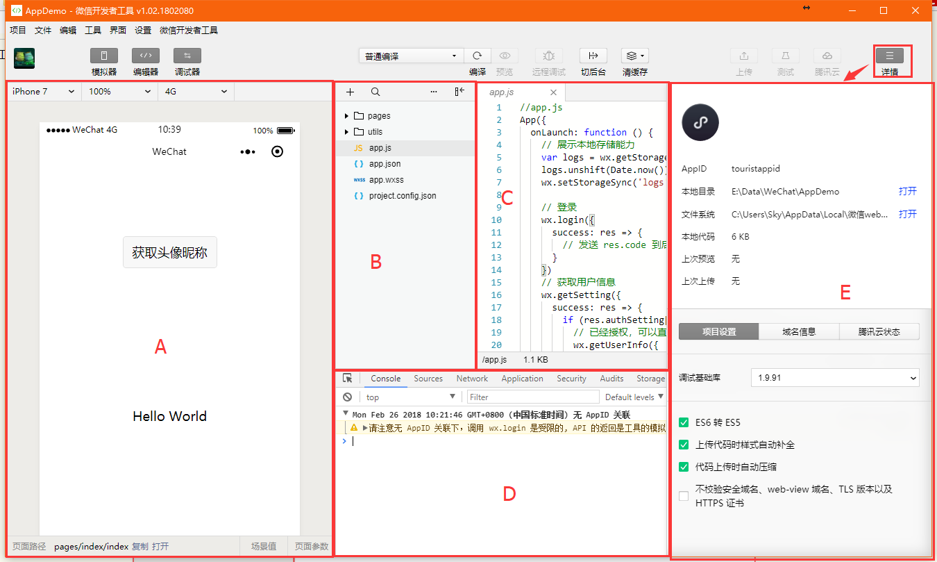 整个界面大致分为A、B、C、D、E四个功能区域