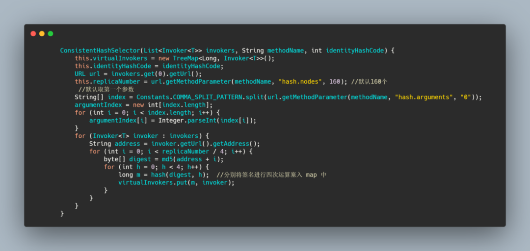 先来看下一致性 hash 的实现,这个 virtualInvokers 是 TreeMap。