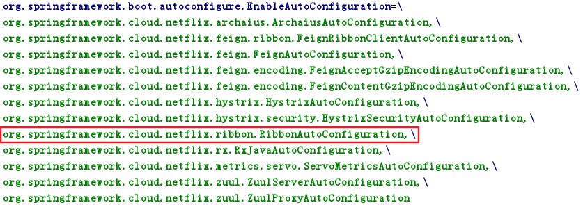 当前版本中的Netflix所有自动配置都在spring-cloud-netflix-core-xxx.jar中,根据其META-INF/spring.factories中的配置得知,Spring Cloud Ribbon的自动配置类为 RibbonAutoConfiguration