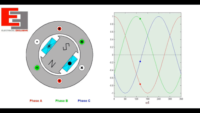 同步发电机,利用旋转的转子磁场在定子中感应发电。其中,转子用于旋转磁场,定子用于切割磁场,所以频率与转子一致,被称为同步发电。