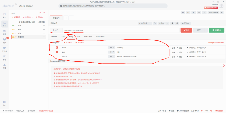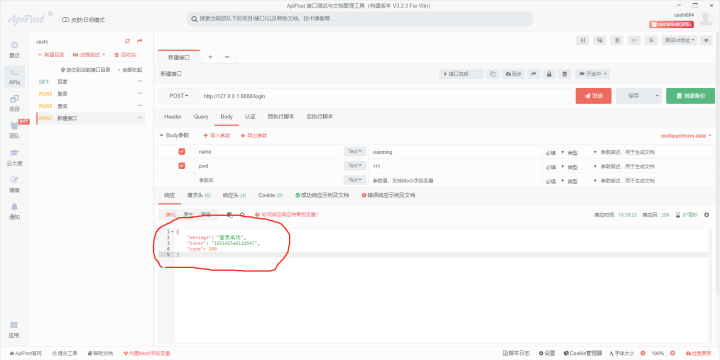 选择请求方法post、请求地址:http://127.0.0.1:8888/login、body参数:name:xiaoming,pwd:111