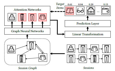 【再次注释:会话就是用户在一段时间内的点击序列,如图中就是两个用户的额点击序列,会话中item之间的连接关系构成会话图,经过gnn网络及注意力(何谓注意力?此处明显可以望文生义得到,边连接越多的item重点关注,大众看的东西可能和你看的东西是相同的,这种情况会不会推出来的全是热点部分(马太/长尾啥的)?关于是否是热点及小的debias方法,可以查看我之前的博文:1如何评价这种偏;2debias即gnn中的做法)处理后再经过线性转换到预测层softmax,其中Target item虚线表示正反向传播,即预测结果与实际结果对比,是一个学习过程】